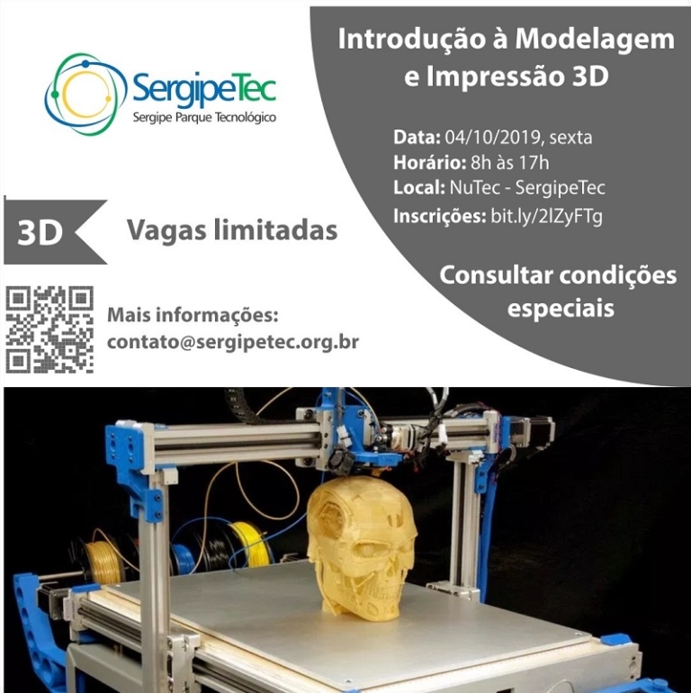 Nesta sexta-feira, 4 de outubro, o Sergipe Parque Tecnológico – SergipeTec – vai realizar a terceira turma de Introdução à Modelagem e Impressão 3D. Das 8h às 17h, na Sala de Treinamento do Núcleo de Desenvolvimento Tecnológico Regional – NuTec. O curso vai trabalhar os processos básicos de modelagem 3D em software de desenho, os processos básicos de planejamento de impressão em software fatiador e os processos básicos de produção de peça em impressão 3D.