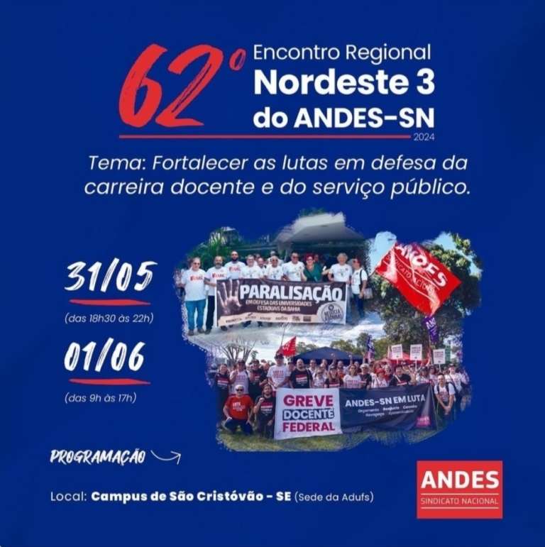 A Universidade Federal de Sergipe (UFS) recebe nos dias 31 de maio e 1 de junho mais um Encontro da Regional Nordeste 3 do ANDES-SN. A Regional engloba as associações docentes dos estados de Sergipe, Bahia e Alagoas, além de suas respectivas bases.