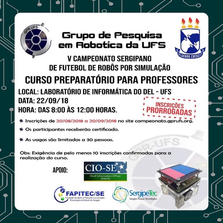Estão abertas até quinta-feira, 20 de setembro, pelo site campeonato.gprufs.org, as inscrições para o V Campeonato Sergipano de Futebol de Robôs por Simulação. Podem participar alunos e professores do 9º ano do ensino fundamental ao 3º ano do ensino médio das escolas sergipanas.