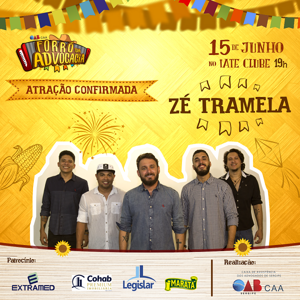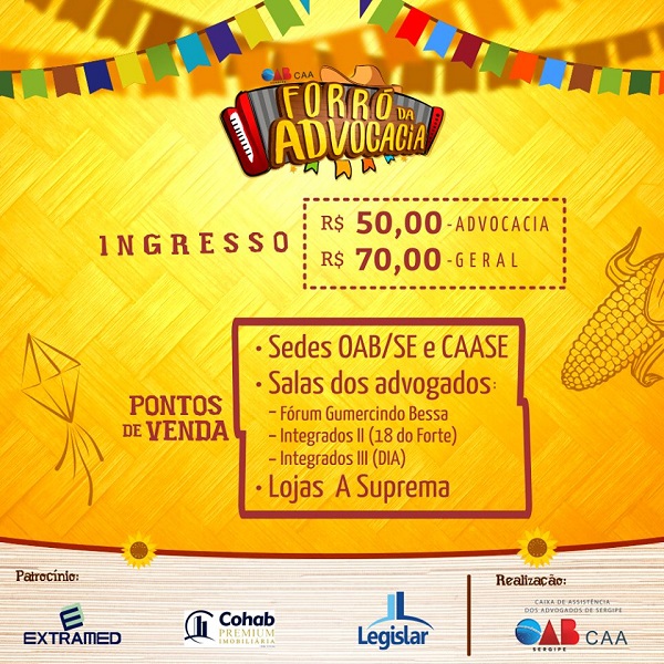 Será realizado no próximo dia 15 de junho, às 19h, no Iate Clube de Aracaju, o Forró da Advocacia 2018. A festa será animada por Mestrinho e a banda de forró universitário Zé Tramela. Além das atrações musicais, a festa contará com espaço kids, comidas e bebidas típicas, além de uma programação animada. Os ingressos já estão à venda ao preço de R$ 50,00 (advocacia) e R$ 70,00 (geral), e podem ser nas sedes da OAB e CAASE , nas Salas dos Advogados dos Fóruns Gumercindo Bessa, Integrados II, no Bairro 18 do Forte, Integrados III, no Distrito Industrial de Aracaju – DIA; e nas Lojas A Suprema.