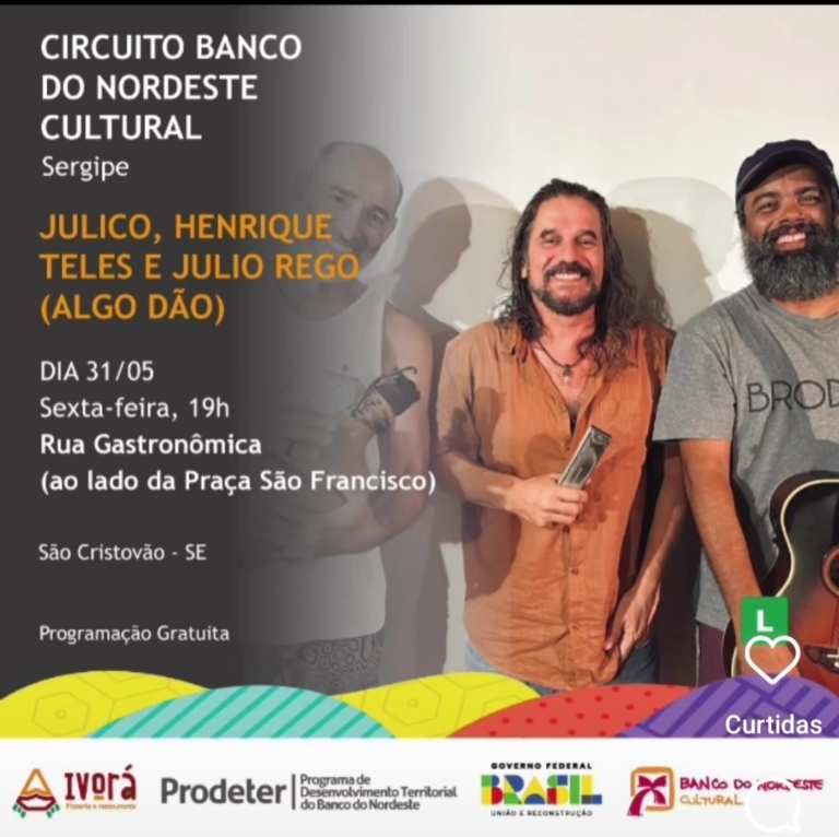 E na sexta-feira, 31, é a vez do trio Julico, Henrique Teles e Julio Rego, que integra o projeto musical Algo Dão. Eles se apresentam na Rua Gastronômica montada ao lado da Praça São Francisco, na cidade de São Cristóvão.