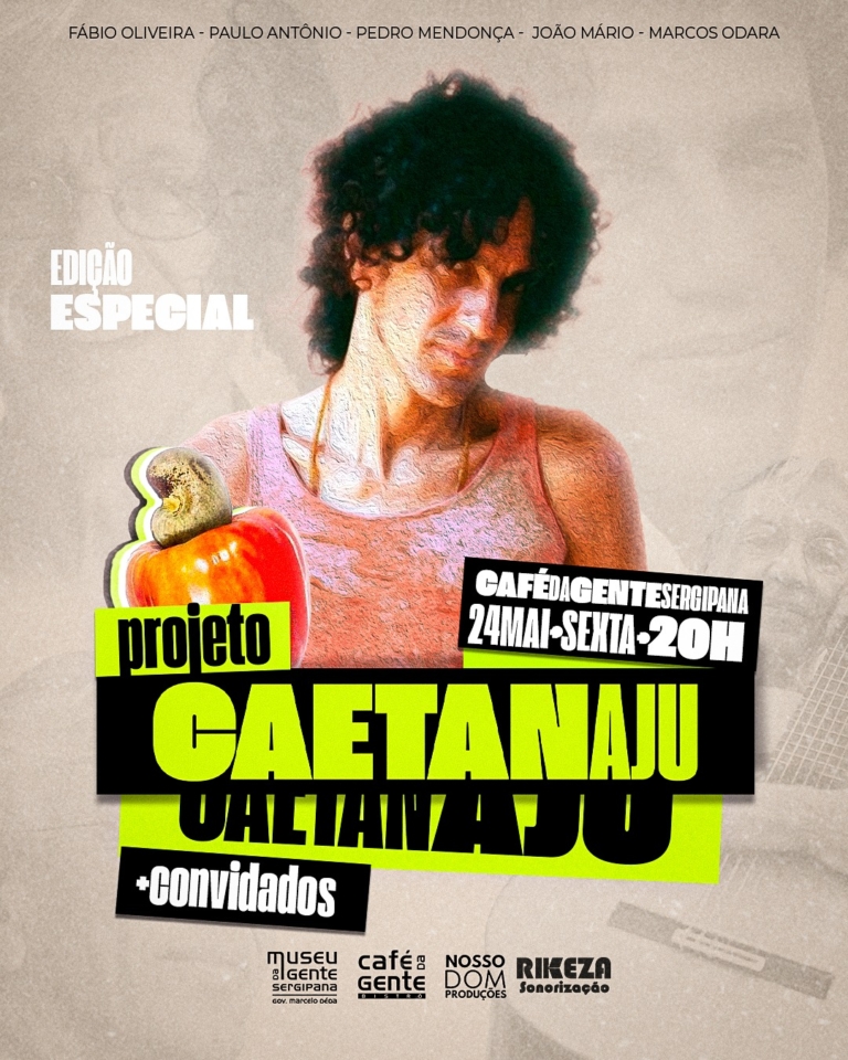 O projeto foi concebido em 2022 por meio de uma parceria entre o cantor e violonista Fabio Oliveira e o baterista Marcos Odara. Com o tempo, o projeto evoluiu para incluir o percussionista e Mestre da Cultura Popular Pedro Mendonça, trazendo uma riqueza rítmica e uma dimensão de grupo ao som. A formação dessa edição do CaetanAju será a seguinte: Fabio Oliveira – Voz Violão, no Contrabaixo Paulo Antônio, João Mário assume a Guitarra, a bateria e voz ficam com Marcos Odara e o maestro Pedro Mendonça promete muito agito com sua percussão. Além da formação principal, o espetáculo contará com participações especiais de Sandy Ale, Soyan, Patricia Luz e Dami Dória.