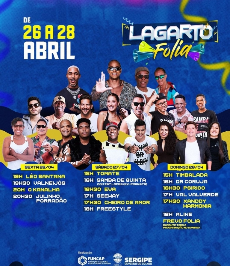 Começa nesta sexta-feira, 26, no município de Lagarto, e segue até o domingo, 28, o Lagarto Folia. A programação do evento conta com diversas atrações, a exemplo de Léo Santana, Tomate, Xanddy Harmonia, Timbalada, Psirico, entre tantos outros artistas que agitarão os foliões nos três dias de festa.