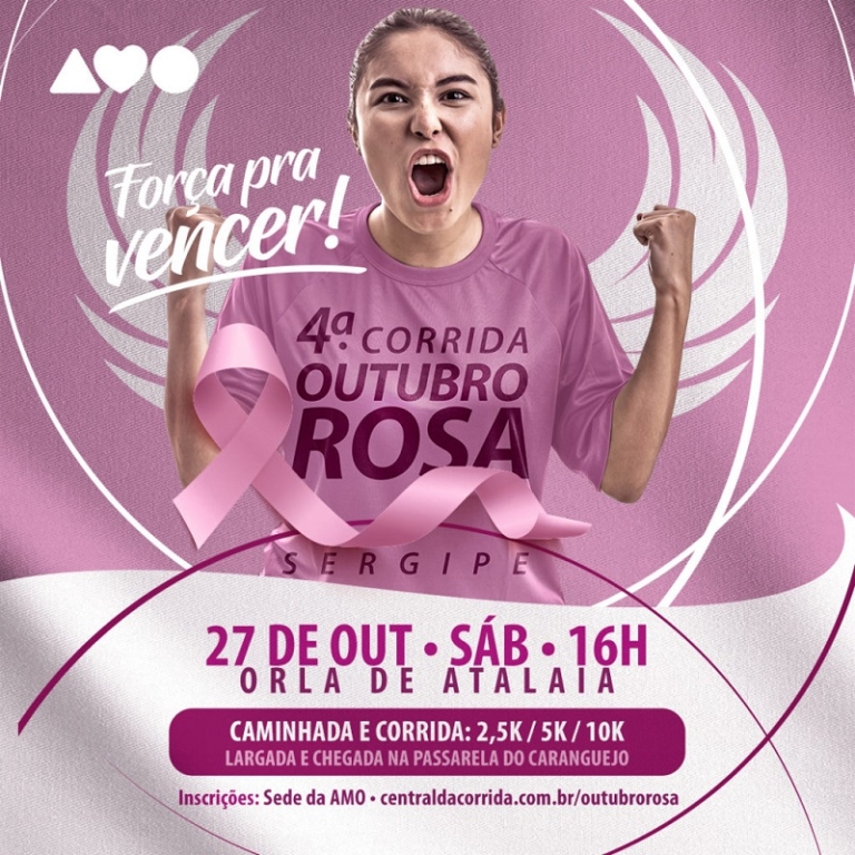 A Associação dos Amigos da Oncologia – AMO – está com as inscrições abertas para a 4ª Corrida Outubro Rosa de Sergipe com o slogan “Força pra Vencer”. A corrida será realizada às 16h, do dia 27 de outubro, na Orla da Atalaia, com pórtico de largada e chegada no estacionamento da Passarela do Caranguejo.