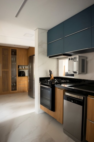 Outro desejo dos moradores era transformar a cozinha em um espaço de convívio social. Por se tratar de um apartamento antigo a arquiteta derrubou as paredes unificando os ambientes. Onde era a parede foi projetada uma mesa de jantar em pedra natural (Via Láctea), entretanto, um dos desafios foi o quadro de energia que estava justamente na parede que seria demolida, “na abertura do quadro geral de energia notei que toda a fiação estava vindo do chão até a altura do quadro, com isso encontrei a solução de apenas abaixar a altura do quadro, sem fazer alteração de parede, permitindo assim que a parede de divisa dos ambientes fosse parcialmente removida”, explica a arquiteta.