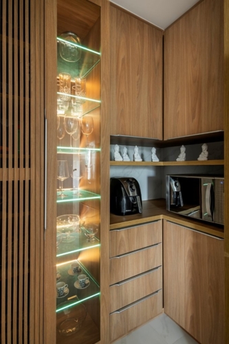 Essa bancada fica de frente à parede de vidro permitindo visibilidade para todo o apartamento. Na parede oposta, a arquiteta criou um armário com portas de vidro para serem expostos acessórios, livros e objetos de gamers. Abaixo, foi projetado um aparador  para armazenar documentos e sobre o móvel foi instalada a impressora e a cafeteira.