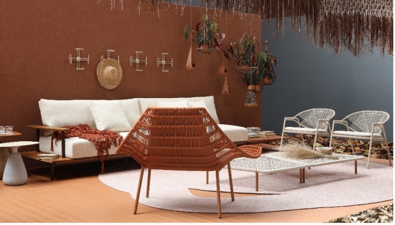 Varanda Argila trabalha com uma paleta terrosa que também caracteriza a coleção DonaFlor 2022, como a poltrona Mantanegra, assinada por Sérgio J. Matos. Criada exclusivamente para a marca, é inspirada na biomimética da Arraia Jamanta, também conhecida como Manta, uma das maiores arraias encontradas no litoral brasileiro. Com estrutura em alumínio e tramas vazadas em corda náutica, a poltrona transmite a sensação de amplitude que só a natureza é capaz de irradiar.
