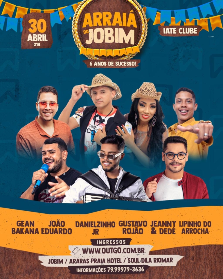 Ingressos: https://outgo.com.br/arraia-do-jobim, Soul Dila (Riomar), Auto Peças Macedo (Hermes Fontes), Araras Praia Hotel e Jobim.