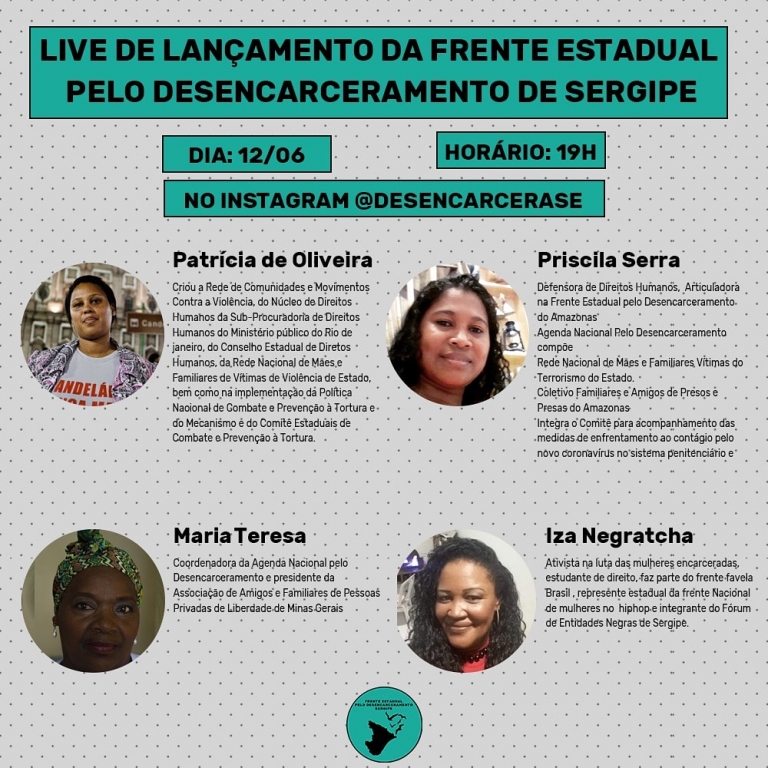 Para marcar o lançamento da Frente Estadual Pelo Desencarceramento em Sergipe foi realizado um debate com transmissão ao vivo nas redes sociais (@desencarcerase), sábado, dia 12, às 19h, com a participação de quatro mulheres negras articuladoras regionais e nacionais da luta pelo desencarceramento no Brasil.