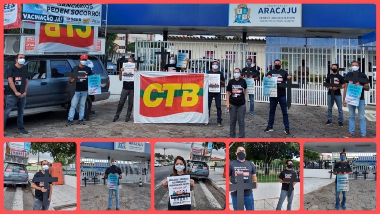 O Sindicato dos Bancários de Sergipe – Seeb/SE – realizou nessa terça-feira, 8, o ato de protesto: “Bancári@s pedem Socorro”, em frente ao Centro Administrativo da Prefeitura Municipal de Aracaju – PMA –, para pedir a inclusão da categoria no Plano Municipal de Vacinação. A carreata, a mobilização nas redes sociais, a deflagração e suspensão da paralisação de 24h e o ato na Prefeitura de Aracaju repercutem em todo o Estado.