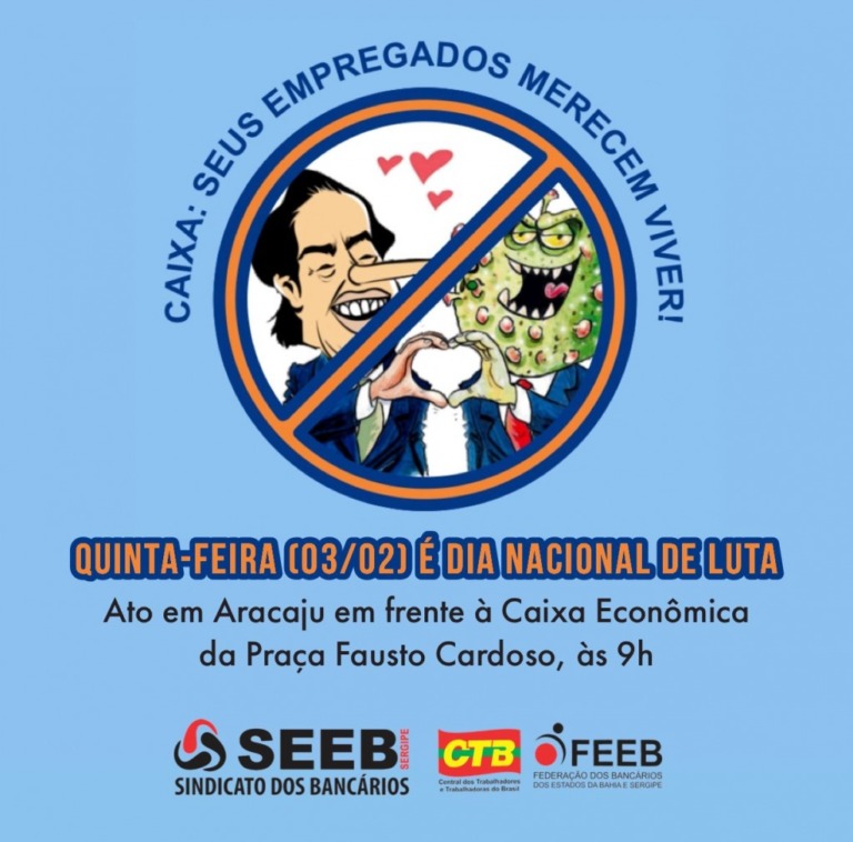 Nesta quinta-feira, 3, protestos nacionais pretendem pressionar desta vez a Caixa Econômica Federal a implementar dentro das agências bancárias protocolos mínimos e eficazes para conter a nova onda da contaminação da Covid-19. Denominado de Dia Nacional de Luta dos Empregados da Caixa, em Aracaju, o ato está acontecendo desde as 9h, na Caixa, localizada em frente à Praça da Fausto Cardoso.