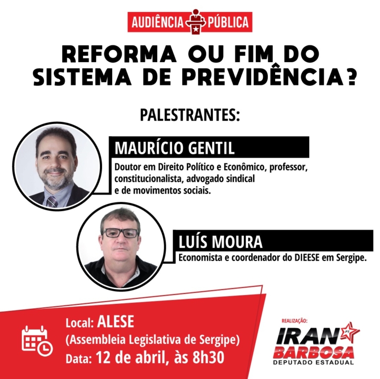 Nesta sexta-feira, 12, às 8h30, na Assembleia Legislativa do Estado – Alese -, o mandato do deputado Iran Barbosa, do PT, promove, em parceria com o Departamento Intersindical de Estatística e Estudos Sócio Econômico – Dieese – e com centrais sindicais de Sergipe, Audiência Pública para debater a proposta de Reforma da Previdência encaminhada pelo Governo Federal. O evento se unifica a Jornada Nacional de Debates organizada pelo Dieese em todo o Brasil.