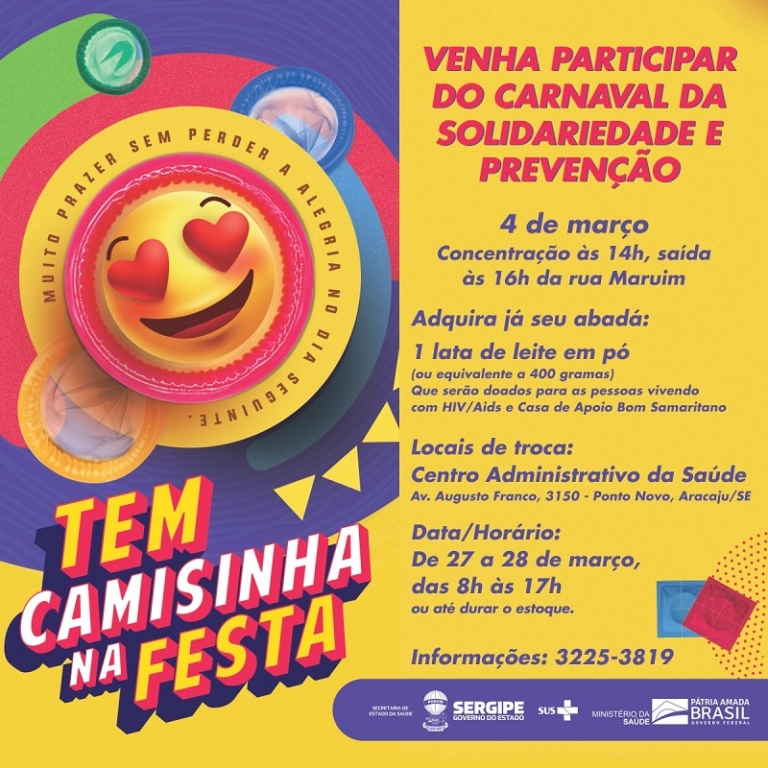 Com o slogan ‘Prevenção e Solidariedade’, o bloco é acessível a qualquer cidadão que queira participar da folia, bastando para isso trocar o abadá por uma lata ou dois pacotes de 200 gramas de leite em pó. “É importante salientar que são 500 abadás para troca”, disse o gerente do Programa IST/Aids, informando que o ponto de troca será no Centro Administrativo da Saúde Senador Gilvan Rocha.