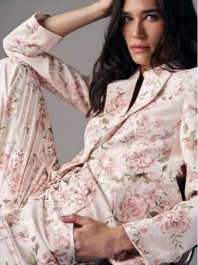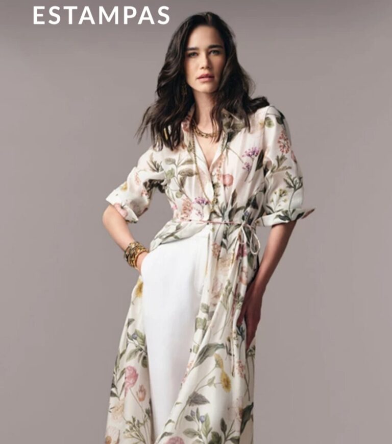 A coleção destaca estampas botânicas reinterpretadas, vestidos de caimento fluido e alfaiataria em xadrez com construção leve, refletindo o tailoring contemporâneo. Os lenços de seda surgem como elemento de styling, ampliando as possibilidades de uso e reforçando a proposta funcional da coleção. A cartela de cores transita por off-white, azul claro, tons naturais e rosé queimado, sustentando uma estética atemporal.
