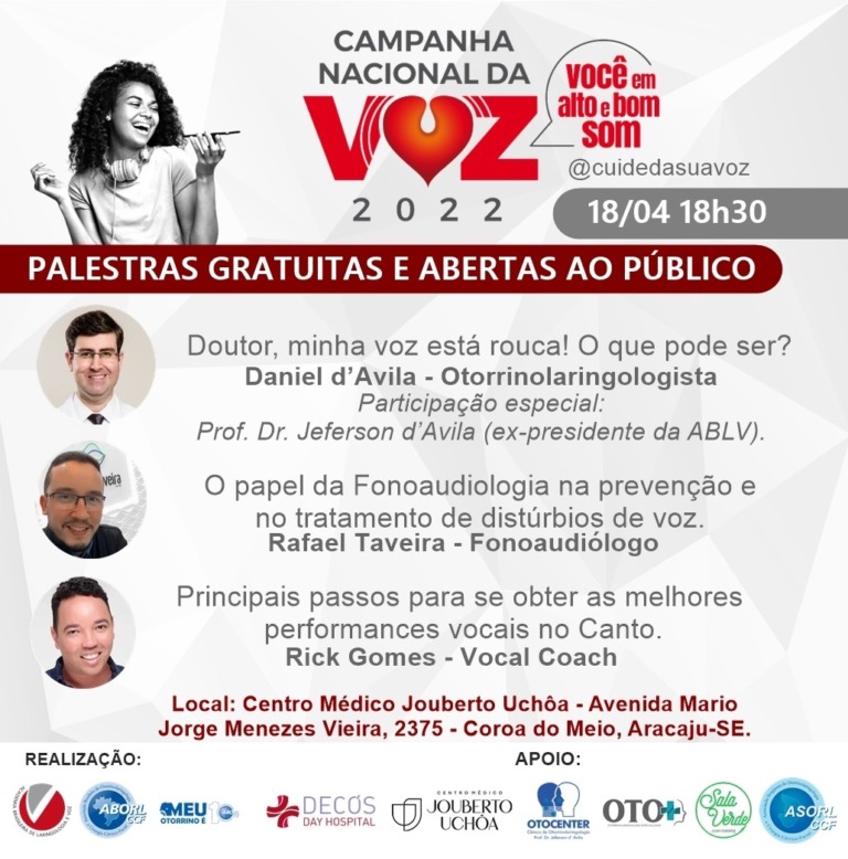 Aracaju receberá evento que faz parte da programação da Campanha Nacional da Voz 2022 na próxima segunda-feira, 18/4, o circuito de palestras gratuitas e abertas ao público conta com os temas: “Doutor, minha voz está rouca! O que pode ser?” com o palestrante Dr. Daniel d’Avila – Otorrinolaringologista, “O papel da Fonoaudiologia na prevenção e no tratamento de distúrbios de voz” – com o Fonoaudiólogo Rafael Taveira, “Principais passos para se obter as melhores performances vocais no Canto” – com o Vocal Coach Rick Gomes.