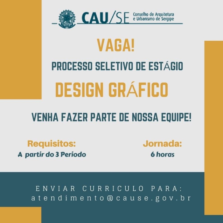Estão abertas as inscrições para o processo seletivo de estágio da área de design gráfico no Conselho de Arquitetura e Urbanismo de Sergipe – CAU/SE.