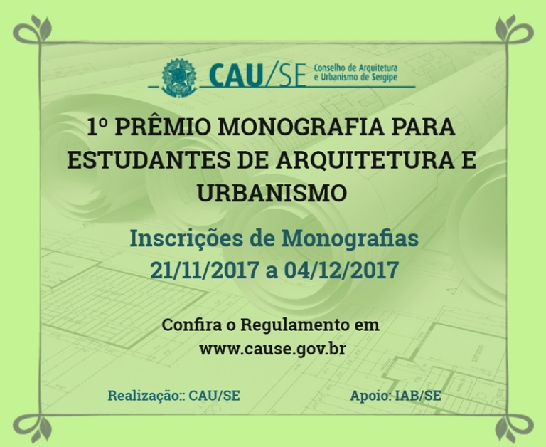 O Conselho de Arquitetura e Urbanismo de Sergipe – CAU/SE – lança o 1º Prêmio para Estudantes de Arquitetura e Urbanismo 2017. O objetivo é promover a valorização da profissão e do egresso da área da Arquitetura e Urbanismo, por meio de premiação e exposição do trabalho.