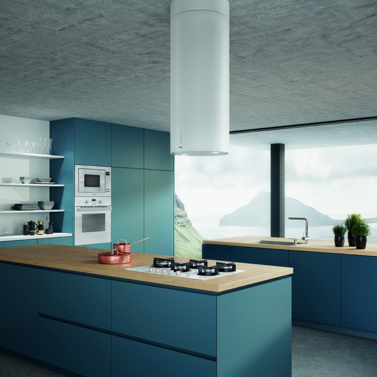Coifa de ilha e com design cilíndrico a Tunnel Plus é perfeita para variados projetos de cozinha com sofisticação minimalista