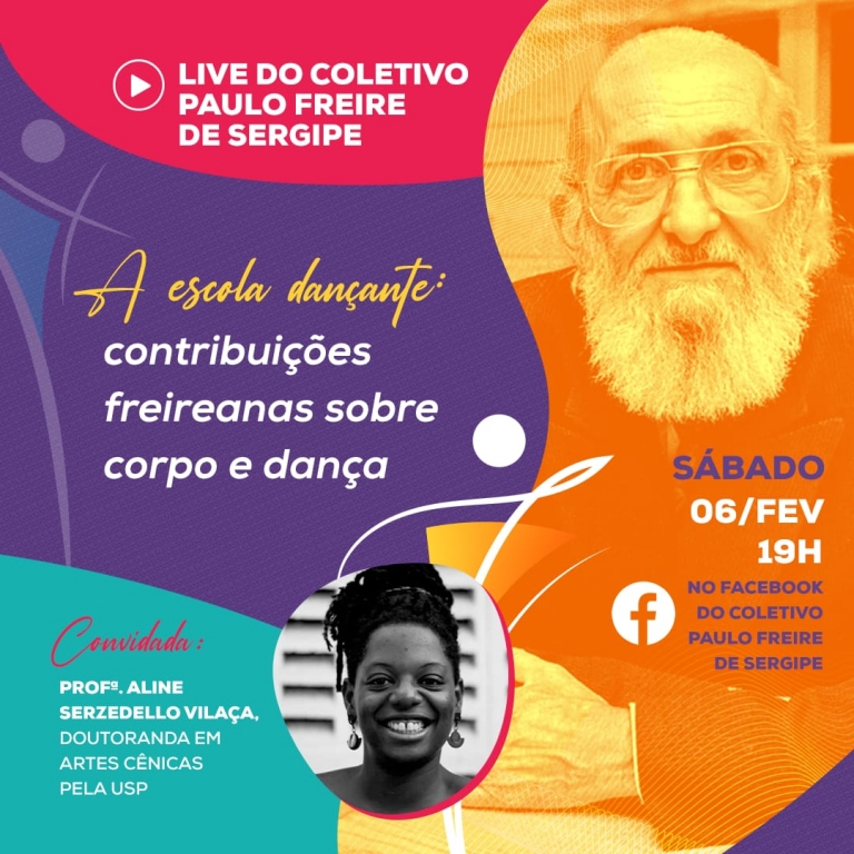 O Coletivo Paulo Freire de Sergipe realiza neste sábado, 6, uma Live sobre o tema “A Escola Dançante: contribuições freireanas sobre corpo e dança, com a Doutoranda em Artes Cênicas, Aline Serzedello, tendo como mediador o professor das Redes municipais de Nossa Senhora do Socorro e Aracaju, Flávio Nascimento.