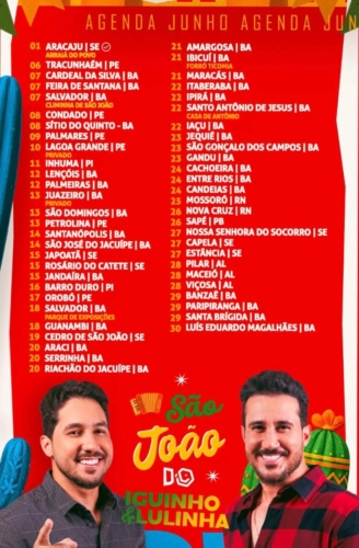 Pelo terceiro ano consecutivo, a dupla sergipana Iguinho e Lulinha lidera a maior agenda de São João do Brasil! São 54 shows em 30 dias, com início no dia 1º de junho em Aracaju (SE) e encerramento marcado para o dia 30 em Luís Eduardo Magalhães (BA). Uma verdadeira maratona musical que atravessa sete estados nordestinos, reafirmando o protagonismo da dupla nas festas juninas.
