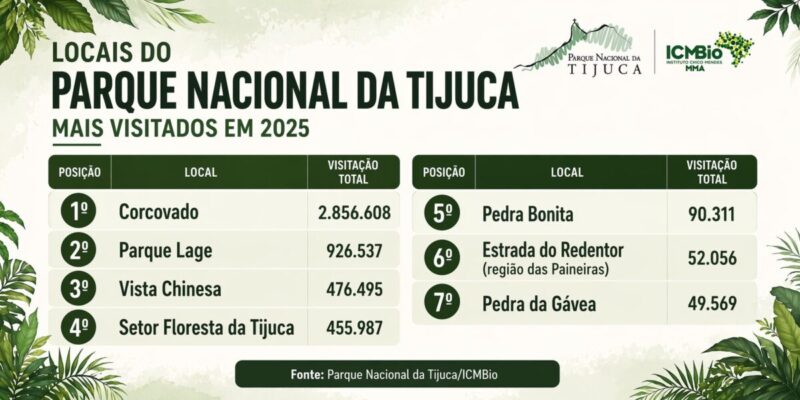 O Parque Nacional da Tijuca fechou o ano de 2025 com o recorde histórico de 4.907.563 visitantes, consolidando-se pelo 18º ano seguido como o parque nacional mais frequentado do país. Para acompanhar esse crescimento, o Instituto Chico Mendes de Conservação da Biodiversidade (ICMBio) – responsável pela gestão do Parque – vem executando um robusto ciclo de investimentos de R$ 75 milhões que já se reflete na experiência de quem visita, por exemplo, o Alto Corcovado. Somente nesta área do Parque, que abriga a estátua do Cristo Redentor, o fluxo saltou de 2,3 milhões em 2024 para mais de 2,8 milhões no ano passado.