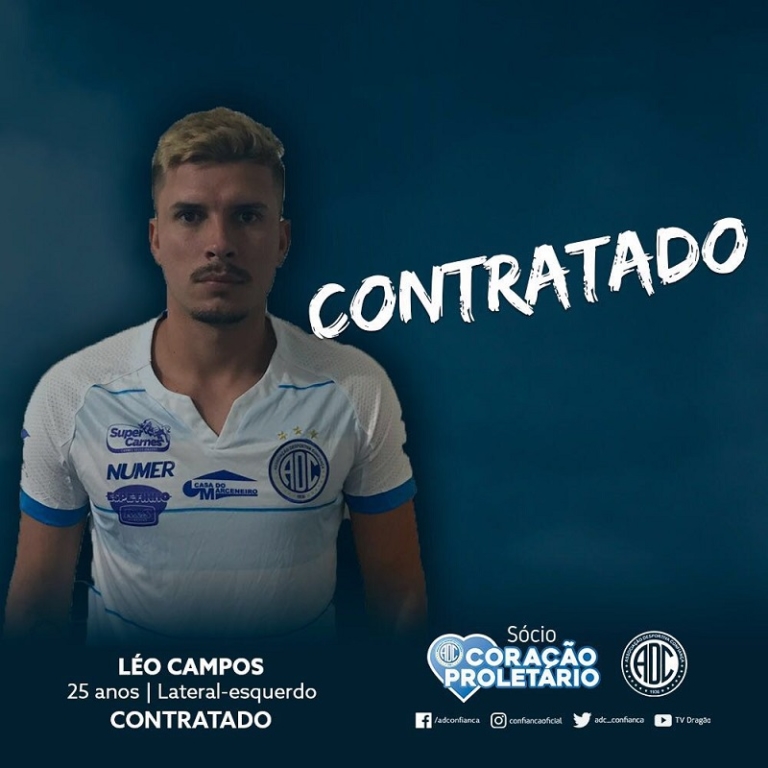 O Confiança anunciou ontem, 6, a contratação de mais um reforço. Trata-se do lateral esquerdo Léo Campos, de 25 anos. Léo é catarinense da cidade de São Carlos e foi formado nas categorias de base do Avaí. Em seu currículo, o atleta possui passagens pelo Grêmio, Audax-RJ, Guarani-SC, Inter de Lages, Sampaio Correa-RJ, ASA e Avenida.