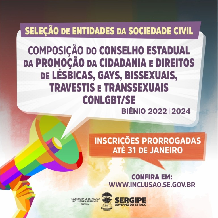 Foram prorrogadas até o dia 31 de janeiro, as inscrições para a seleção de entidades e organizações da sociedade civil que desejem compor o Conselho Estadual da Promoção da Cidadania e Direitos de Lésbicas, Gays, Bissexuais, Travestis e Transexuais – CONLGBT/SE –, para o biênio 2022-2024. A prorrogação foi divulgada através de Retificação do Edital, publicado pela Secretaria de Estado da Inclusão e Assistência Social – SEIAS – e CONLGBT/SE no site www.inclusao.se.gov.br, onde também estão disponíveis a ficha de inscrição e mais informações.