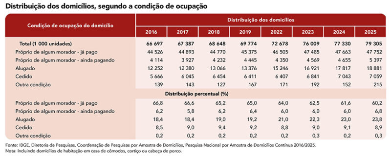 Em 2025, o número de domicílios particulares permanentes aumentou 18,9%, de 66,7 milhões para 79,3 milhões, em comparação com 2016. Neste período, o número de domicílios alugados foi o que mais cresceu, 54,1%, de 12,2 milhões para 18,9 milhões. Já os domicílios próprios ainda pagando tiveram elevação de 31,2%, enquanto os já pagos subiram 7,3%. As informações são da Pnad Contínua: Características dos domicílios e moradores, divulgada no último dia 17 pelo IBGE.
