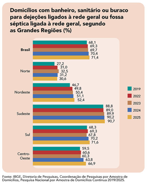 De 2019 para 2025, a proporção de domicílios particulares permanentes com esgotamento sanitário por rede coletora aumentou de 68,1% para 71,4%. Já 98,4% dos domicílios possuíam banheiro de uso exclusivo no ano passado, enquanto em 2019 era de 97,7%. Em áreas urbanas, 99,5% dos domicílios tinham banheiro de uso exclusivo, em 2025, e em 79,3% o escoamento era feito por rede geral. Já em áreas rurais, a proporção era de 90,3% dos domicílios com banheiros exclusivos e em apenas 8,9% o escoamento do esgoto era feito pela rede geral. As diferenças regionais foram acentuadas em relação a domicílios com acesso à rede geral de esgotos: Norte, 30,6%; Nordeste, 52,4%; Centro-Oeste, 66,9%; Sul, 71,6%; e Sudeste chegando a 90,7%.