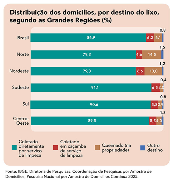 A coleta direta por serviço de limpeza foi o destino do lixo em 86,9% dos domicílios particulares permanentes no Brasil em 2025. A modalidade foi a principal em todas as grandes regiões, variando de 79,3%, no Nordeste, a 91,1%, no Sudeste. Já a queimada na propriedade foi o destino do lixo em 4,8 milhões de domicílios do país, sendo 3,6 milhões no Norte e no Nordeste. As duas regiões tiveram recuo frente aos percentuais de 2016: Norte, de 18,6% para 14,5%, e Nordeste, de 17,2% para 13,0%. Nas áreas rurais do país, 50,2% dos domicílios tinham a queima na propriedade como destino do lixo, seguido pela coleta direta por serviço de limpeza (32,4%) e a coleta em caçamba de serviço de limpeza (12,6%). Nas áreas urbanas, o principal destino do lixo foi a coleta direta por serviço de limpeza, em 94,0% dos domicílios.