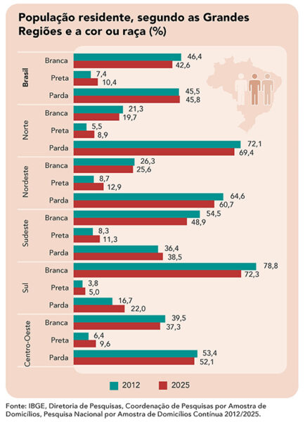 De 2012 a 2025, o percentual da população que se declarava de cor ou raça branca caiu 3,8 p.p., passando de 46,4%, em 2012, para 42,6%, em 2025. A participação da população de cor ou raça preta cresceu de 7,4% em 2012 para 10,4% em 2025. Já população declarada de cor ou raça parda registrou pouca variação em relação a 2012, de 45,5% para 45,8%.