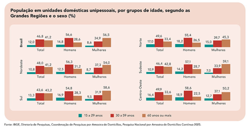 As mulheres eram 45,1% das pessoas que moravam sozinhas em 2025, enquanto os homens eram 54,9%. Há marcantes diferenças entre homens e mulheres que moravam sozinhos quanto ao perfil etário: 56,6% dos homens em arranjos unipessoais tinham 30 a 59 anos, seguidos por aqueles de 60 anos ou mais (28,6%); e, entre as mulheres, a maioria situava-se na faixa de 60 anos ou mais (56,5%).