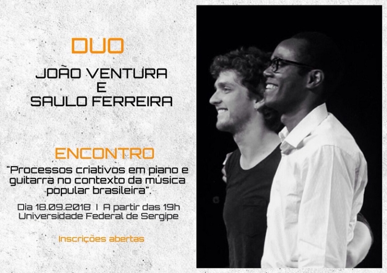 No próximo dia 18, às 19h, o Departamento de Música da Universidade Federal de Sergipe promove o encontro entre o pianista João Ventura e o guitarrista Saulo Ferreira. A ação de extensão tem por objetivo possibilitar a interação entre o público e os artistas, no intuito promover uma troca de informações e de experiências vividas dentro e fora do ambiente acadêmico.