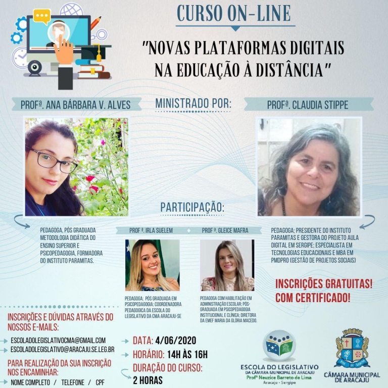 A ação será ministrada pela pedagoga, especialista em metodologia didática do ensino superior e psicopedagogia, profª Ana Bárbara V. Alves, e pela pedagoga, especialista em tecnologias educacionais, presidente do Instituto Paramitas e gestora do Projeto Aula Digital em Sergipe, profª Claudia Stippe. O evento contará também com a participação das professoras Irla Suelem e Gleice Mafra.