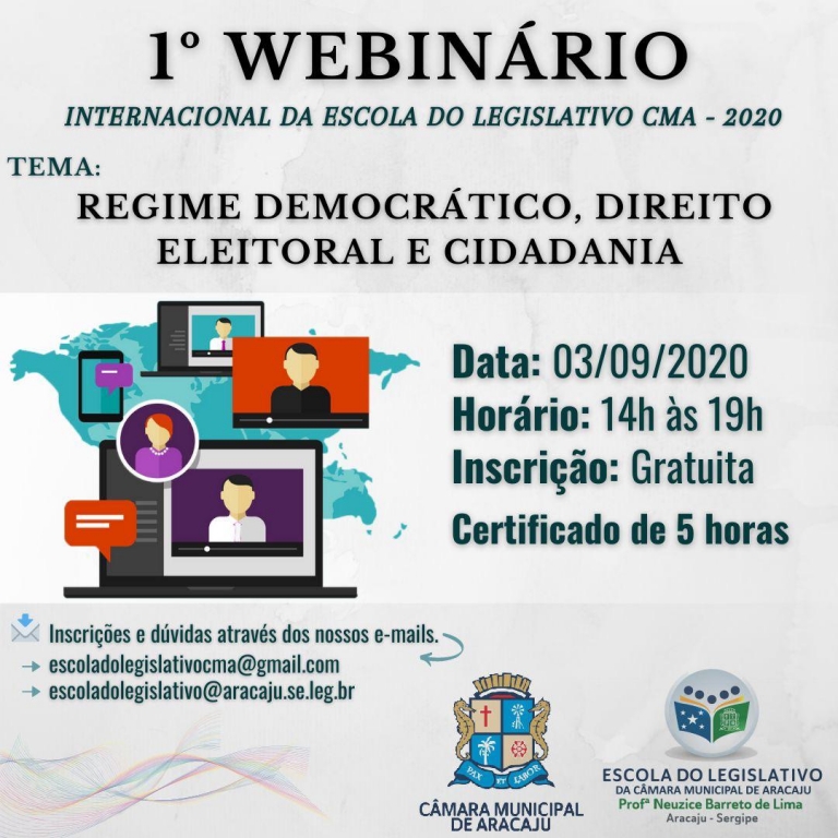 A Escola do Legislativo Profª. Neuzice Barreto de Lima irá realizar no dia 3 de setembro o 1º Webinário Internacional “O regime democrático, direito eleitoral e cidadania”. O evento é gratuito e acontecerá das 14h às 19h, de forma on-line.
