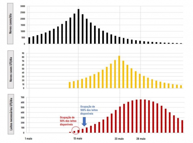 “A projeção neste cenário é que Sergipe tenha a partir da metade do mês de maio entre 3.000 e 4.000 casos confirmados do novo coronavírus, pelo menos 70 novos casos com necessidade de internamento em unidade de terapia intensiva cerca de 10 dias após o ápice da curva, e saturação precoce dos leitos disponíveis,” aponta Paulo Martins.