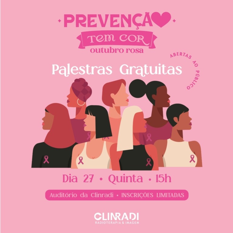 Nesta quinta-feira, 27, o público sergipano receberá palestras gratuitas no evento de encerramento da Campanha Outubro Rosa em Sergipe. Com o tema “Prevenção tem Cor”, a programação acontecerá no auditório da Clinradi que fica na Avenida Antônio Carlos Leite Franco, 500 – Bairro Jardins, a partir das 15h, com uma mesa redonda sobre câncer de mama, epidemiologia, prevenção, sinais de alarme e outros aspectos, além do tratamento de radioterapia com a Radio-Oncologista Dra. Gabriella Chagas.