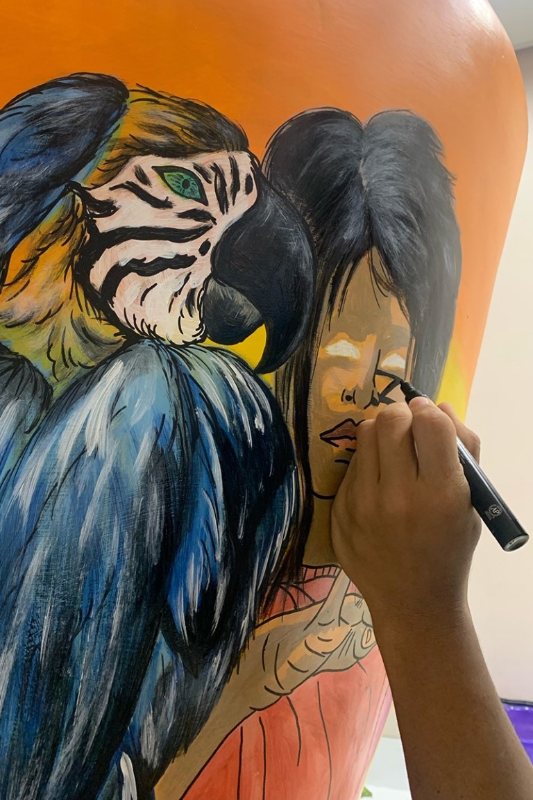 Abraçando esse movimento artístico que exala singularidade, o Shopping Jardins convidou Fábio Sampaio e outros sete talentos da cidade para, juntos, proporcionarem ao público uma experiência que faça pulsar em cada um a felicidade que é viver na cidade dos cajus e papagaios. Desde a sexta-feira, 17 de março, o visitante tem a oportunidade de apreciar e sentir as emoções afloradas por instalações com obras de Lucas Lemos, Aimée e Nogueira e lounge assinado por Gigi Pandim com peças produzidas por artesãs do povoado Serra do Machado, no agreste sergipano, além de dois cajus gigantes, sendo um pintado pelo próprio Fábio Sampaio e outro pelos jovens Alysson Oliveira, Amanda Lima, José Bento e Laisson Macedo, do Instituto JCPM de Compromisso Social.