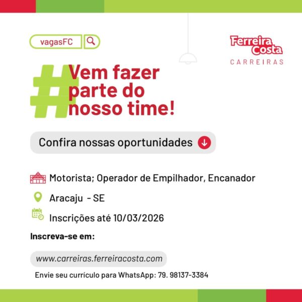 A Ferreira Costa, referência no setor de home center, está com processo seletivo aberto para a contratação de 30 novos colaboradores para integrar o time de sua unidade em Aracaju. As vagas disponíveis são destinadas aos cargos de motorista, operador de empilhadeira e encanador, buscando profissionais que desejam atuar em uma estrutura robusta e dinâmica.