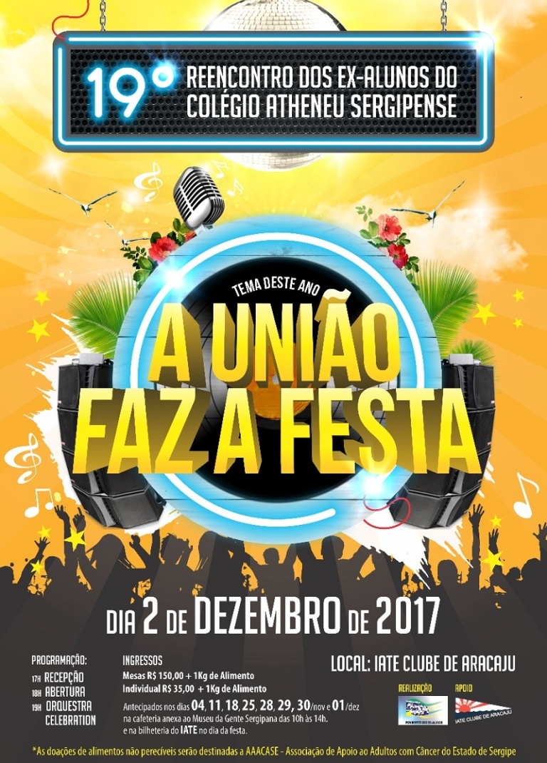 No próximo dia 2 de dezembro, a partir das 17h, será realizada no Iate Clube Aracaju, a 19ª Festa dos Ex-Alunos do Atheneu Sergipense.