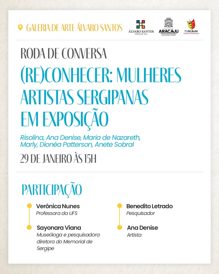 Nesta quarta-feira, 29, às 15h, a Galeria de Arte Álvaro Santos, vinculada à Fundação Cultural Cidade de Aracaju (Funcaju), promove a Roda de Conversa (Re) Conhecer-Mulheres artistas sergipanas em exposição, com especialistas que abordarão a vida e obra de artistas mulheres em exibição na exposição atual, destacando a importância de seus trabalhos na história da arte sergipana.