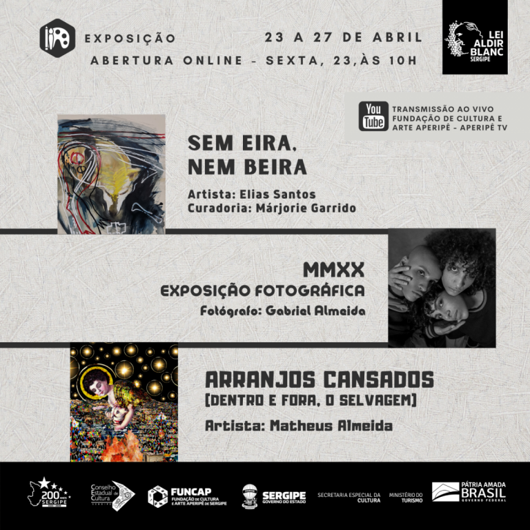 Desta sexta-feira, 23, a 27 de abril, a Galeria De Arte J. Inácio receberá novas exposições de artistas contemplados através do editais promovidos pela Fundação de Cultura e Arte Aperipê – Funcap –, via recursos da Lei Aldir Blanc: “Sem Eira, Nem Beira”, de Elias Santos; “Arranjos Cansados (Dentro e Fora, O Selvagem)”, de Matheus Almeida Cordeiro e “MMXX – Exposição Fotográfica” de Gabriel de Almeida compõem mais uma das exposições que a Funcap vem promovendo. A solenidade de abertura, que acontecerá de modo virtual na sexta-feira, 23, às 10h, será transmitida via Instagram e Youtube da Funcap.