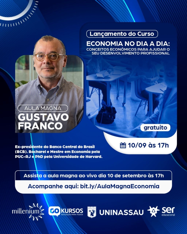 No dia 10 de setembro, às 17h, a Ser Educacional, mantenedora da UNINASSAU, UNAMA, UNINORTE, UNG e UNI7, realiza a Aula Magna de lançamento do curso “Economia no Dia a Dia: Conceitos econômicos para ajudar o seu desenvolvimento profissional”. A aula é conduzida por Gustavo Franco, ex-presidente do Banco Central, mestre em Economia pela PUC-RJ e PhD pela Universidade de Harvard, e um dos criadores do Plano Real.