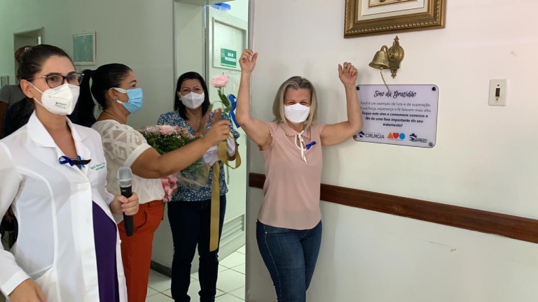 “Estou emocionada. Recebi alta no dia 9 de outubro, e, coincidentemente, fui a primeira paciente curada do câncer que toca o “Sino da Gratidão”. Sinto-me muito abençoada e honrada. Com certeza, toquei com todo gosto. Comecei o tratamento na Oncologia do Cirurgia em março de 2020 e encerrei em julho. Tive um tratamento maravilhoso. Fui muito bem atendida pelas técnicas, enfermeiras, pela minha médica, a Dra. Lívia”, relatou a paciente Aparecida Lopes, 60 anos.