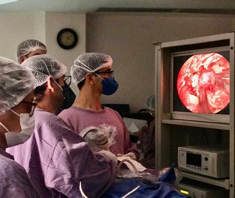 “Os tumores que são operados por meio deste acesso estão localizados no clivus (osso da base do crânio) ou atrás dele, dentro do crânio. É uma região difícil de chegar, pois fica bem no meio do crânio. Então, ao invés de abrirmos o crânio, acessamos o tumor através do nariz. A equipe de otorrinolaringologistas que trabalha conosco no Hospital de Cirurgia faz o acesso cirúrgico e nos leva, através da câmera de vídeo, até a região que chamamos de esfenoide”, comenta Dr. Arthur Maynart.