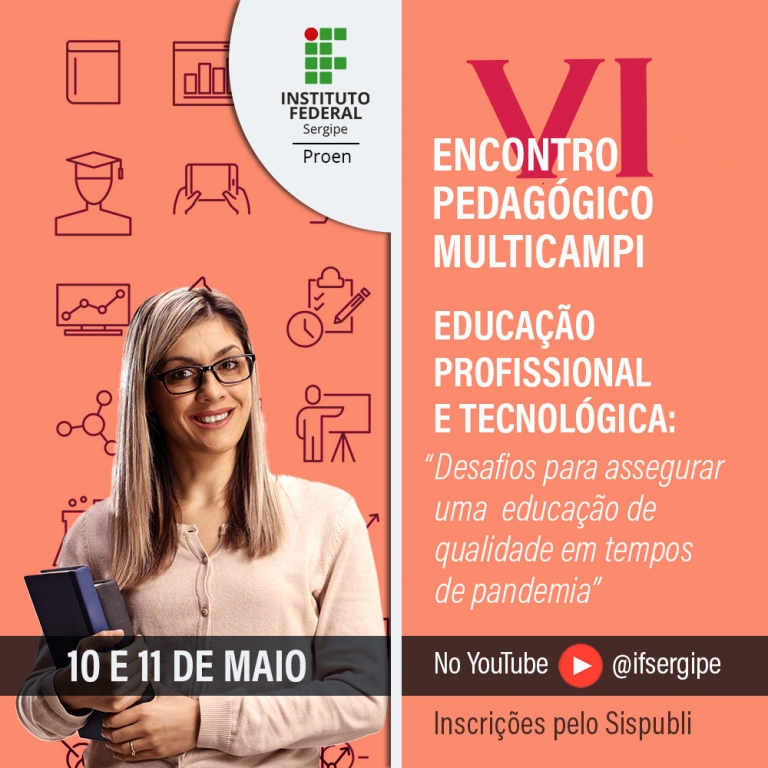 Nos dias 10 e 11 de maio, o Instituto Federal de Sergipe – IFS –, através da Pró-reitoria de Ensino – Proen – promoverá o VI Encontro Pedagógico Multicampi. Com o tema: “Educação Profissional e Tecnológica – desafios para assegurar uma educação de qualidade em tempos de pandemia”, o evento será totalmente on-line e ocorrerá no canal oficial do IFS no YouTube. Os interessados poderão se inscrever através do Sistema de Publicações do Instituto, o Sispubli.