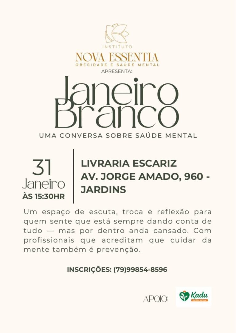 Em sintonia com o movimento nacional do Janeiro Branco, que incentiva a reflexão e o cuidado com a saúde mental, o Instituto Nova Essentia realiza, no sábado, dia 31 de janeiro, um encontro especial em Aracaju voltado à promoção do bem-estar emocional e da qualidade de vida.