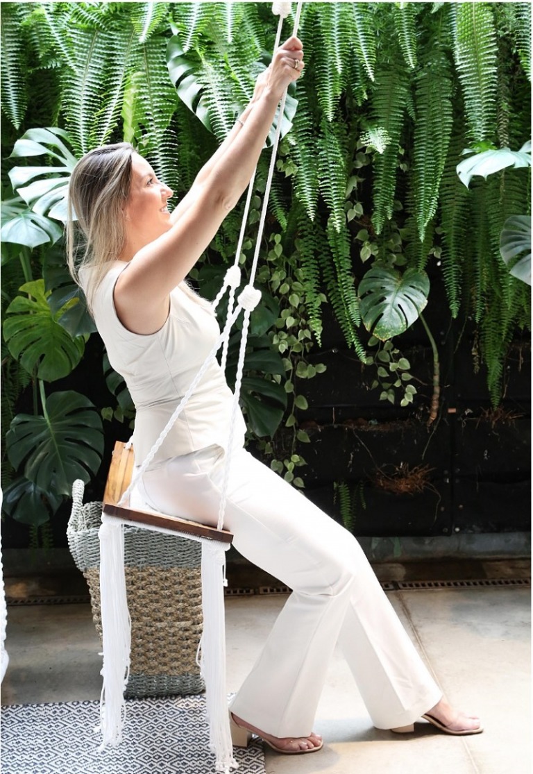 A designer Marta Manente em seu icônico balanço, que ganhou versão outdoor, é uma das peças da designer que estará exposta na Semana do Design