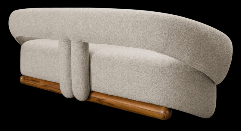 “O grande gesto de design da coleção está no desenho das costas do sofá, onde uma linha central organiza e conduz visualmente toda a peça. Esse elemento percorre o encosto e desce até a base, conectando-se a uma estrutura em madeira que sustenta o conjunto”, diz Marta Manente.
