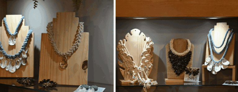 Já a diretora criativa da Shiá, Shirley Alencar, trouxe para o evento a natureza marinha, retratada por meio do aproveitamento das cascas de ostras, que, juntamente com o macramê, técnica milenar de artesanato, dá forma aa colares, brincos e anéis. ‘É o pertencimento cultural do local onde a gente mora”, relata. O ateliê, que fica em Barra de São Miguel, fez uma colab com a mãe de Shirley, com peças em crochê, transformando as cascas das ostras descartadas na comunidade quilombola da Palateia, em matéria-prima sustentável.